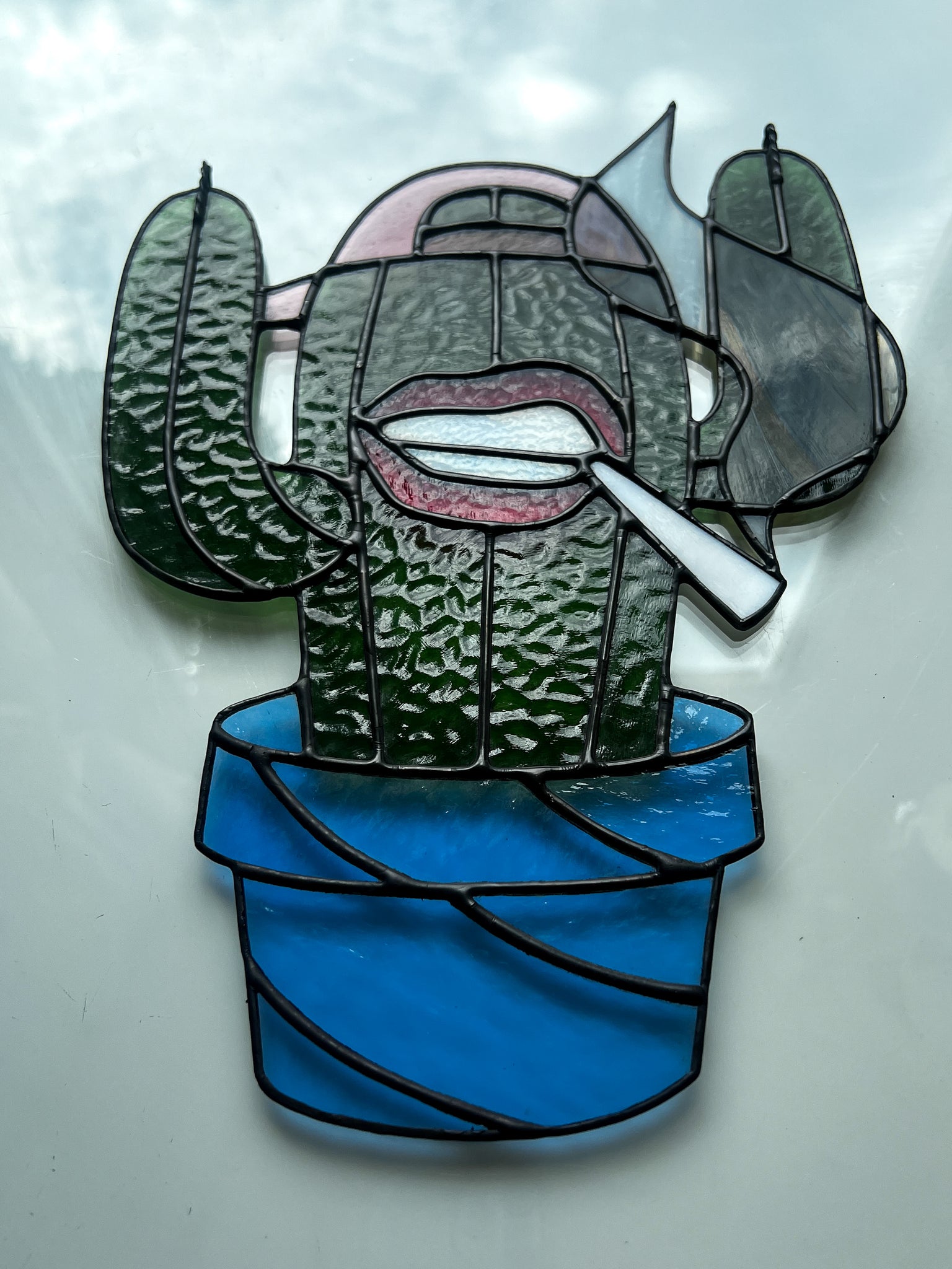 • Load image into Gallery viewer, Cactus Punk Stained Glass - dark green with mauve and blue accents