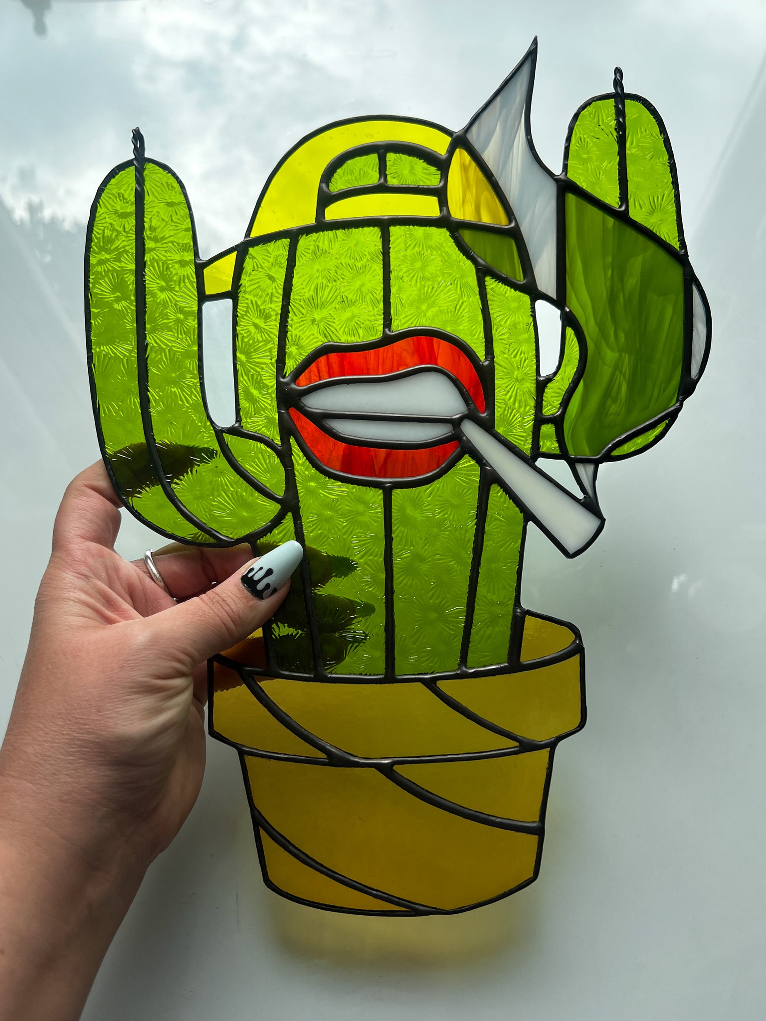 The punks are back! I made 5 color variations with this batch. This piece features a lime green florentine glass for the body with a light amber pot, bright yellow hat, and bright red lips.