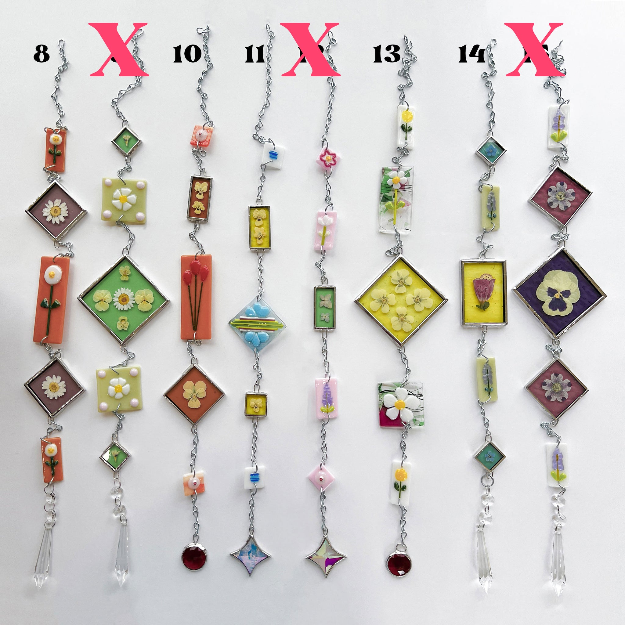 A collection of pure spring. Each flower chain features fused glass, pressed flowers sealed in stained glass or a combo of both. Prices vary depending on complexity of design and number of pieces.
