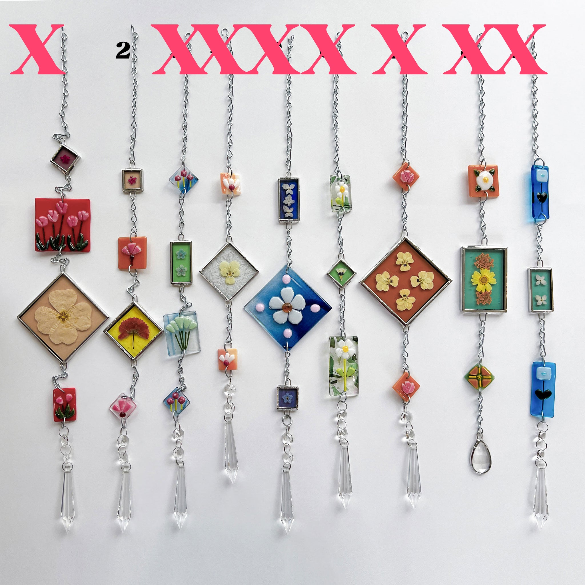 A collection of pure spring. Each flower chain features fused glass, pressed flowers sealed in stained glass or a combo of both. Prices vary depending on complexity of design and number of pieces.