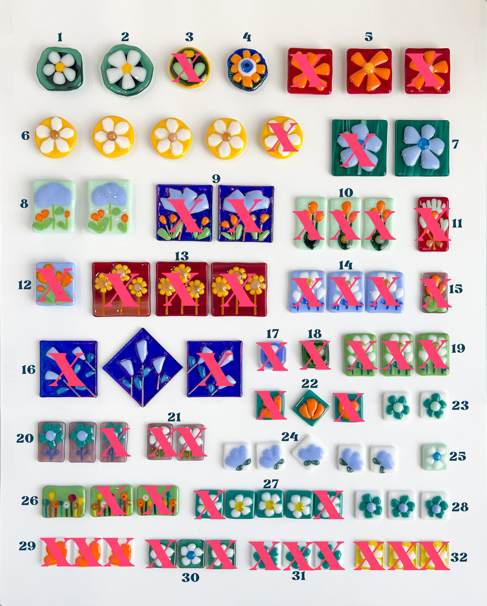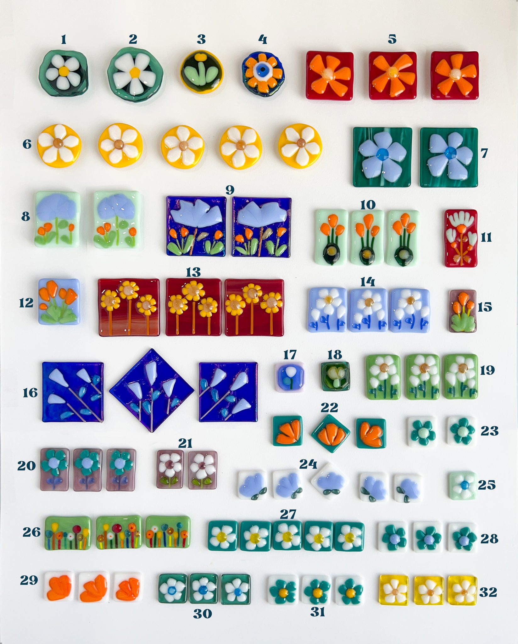 How Ordering Works: Each design has a number (1-32 in the photo). When you select a design number, you're choosing the flower style—like "Design 1: White Daisy on Teal Square" or "Design 5: Orange Flower on Red Square."
