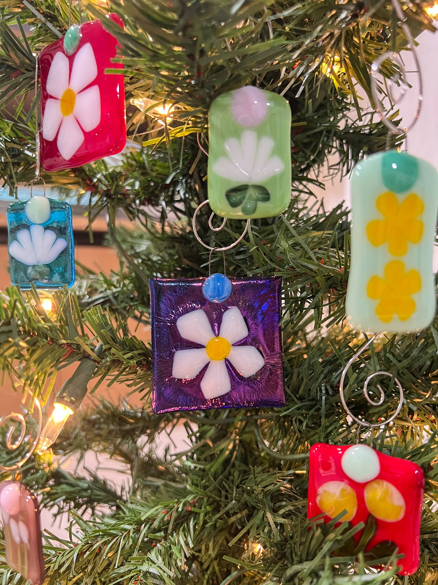 Flowers that won't die on you. These fused glass floral ornaments are made from hand-cut glass pieces and delicate stringers that form stems, petals, and leaves. Each one is a tiny garden you can hang anywhere without worrying about watering, sunlight, or whether you have a black thumb.